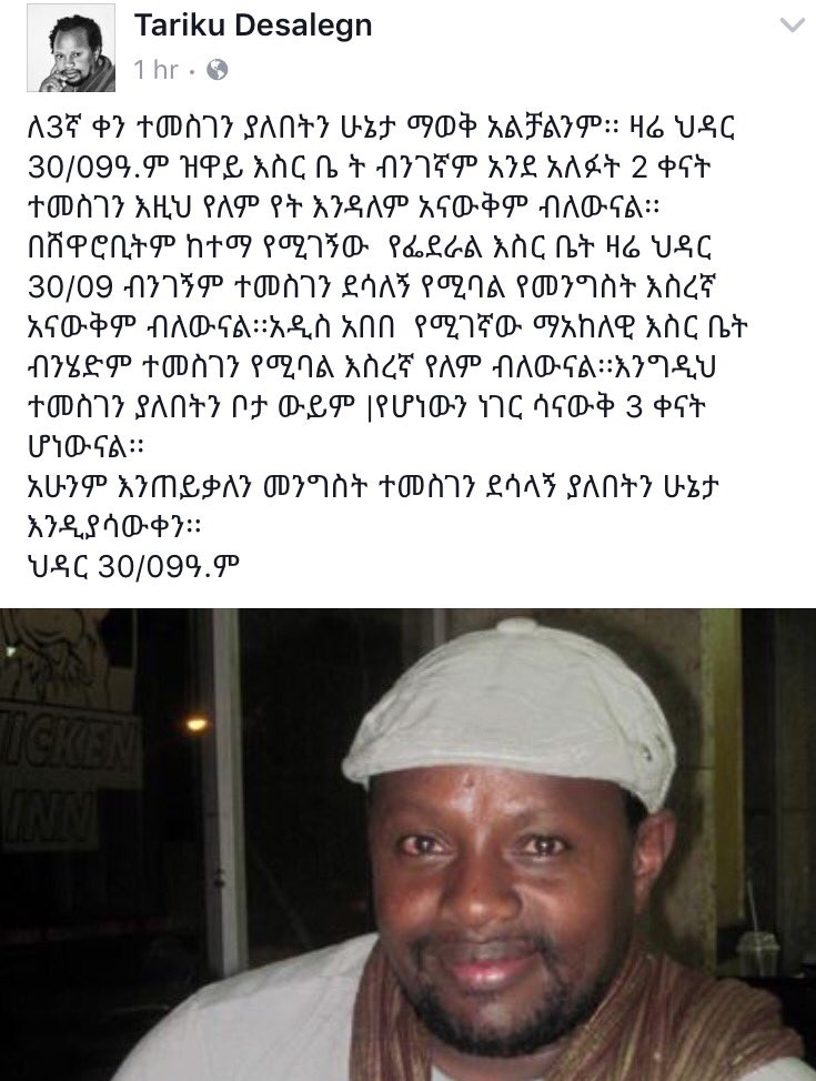 It has been three days since the disappearance of Ethiopian Journalist, Temesgen Dessalgn from where he was detained.